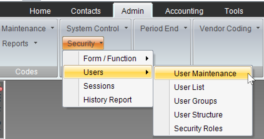 1. Go to the User Maintenance module: Admin tab > Security > Users > User Maintenance.