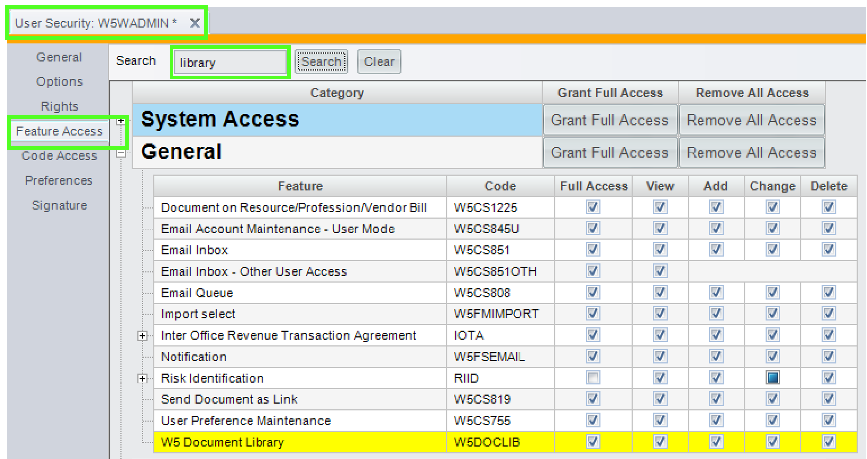 Uncheck the Change and/or Delete checkboxes for W5 Document Library listing as needed (highlighted below).