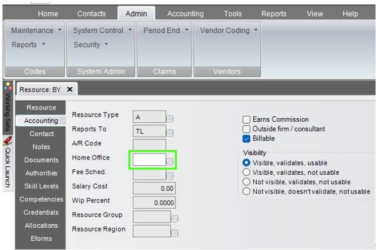 3. With the Accounting tab selected (left panel), Lookup and select the Home Office for that Resource.
